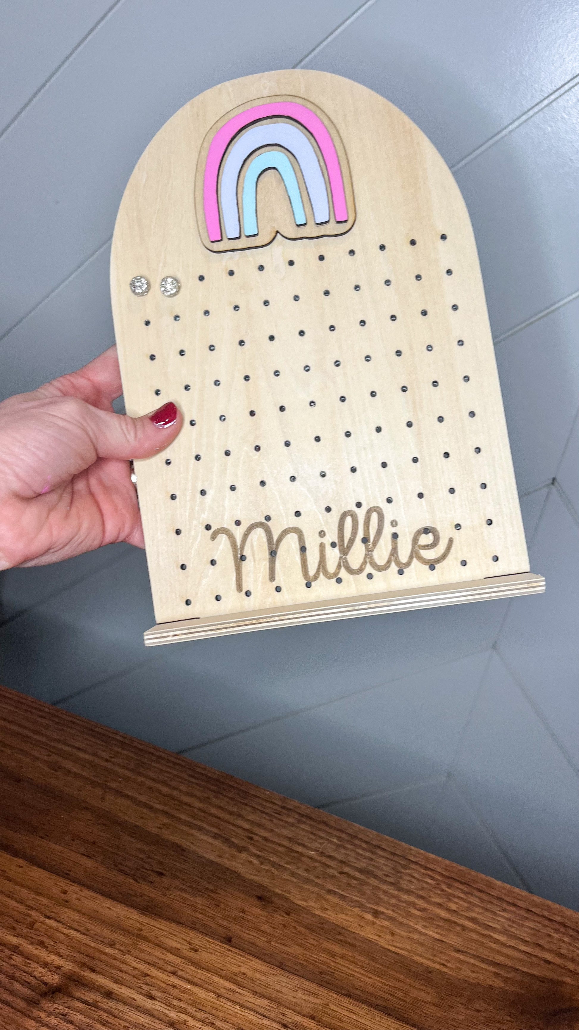 Personalized earring stand has the ability to hold 55 studs and a sturdy base, this earring display will make your jewelry feel accessible and organized. The arched earring holders are great for kids rooms to organize their earrings. It also makes a great gift for moms, daughters, grandmothers, and more! The organizer holds both Stud and dangle earrings.